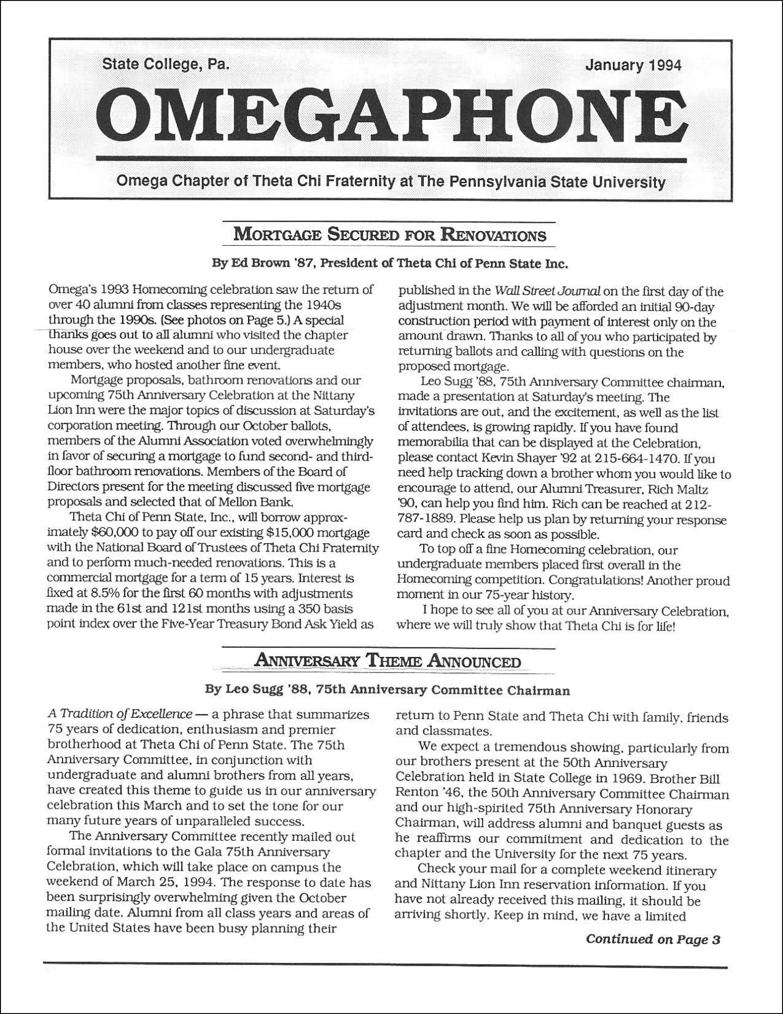 On behalf of the Alumni Corporation and the entire chapter, I would like to thank Chris Heidrick '91 for his pro-bono work on the 1991-92 taxes . . . The 75th Anniversary of Omega Chapter will be held March 25-27, 1994, at the Nittany Lion Inn. Please plan to attend; it'll be worth the trip….Walter White '48 and Bill Renton '46 are trying to organize a reunion for brothers from the '40s to coincide with the 75th Anniversary. If you are interested, contact them directly or through our Alumni[Records Office…Austin N. Lentz, Beta Kappa Fraternity '35, would like to hear from other Beta Kappas…Don't forget that with any donation of $35 or more to the fraternity, the Alumni Corporation will send you a beautiful ink portrait of the Theta Chi House . . . Do you host an annual alumni dinner, golf tournament, or other outing? If so, take a few pictures, write down a few words and send them to me for inclusion in an upcoming Omegaphone …Want a better Omegaphone? Have any ideas for improvement or stories to tell about Theta Chi? Write an article for a future Omegaphone and send it along.