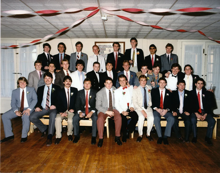Spring Formal - April 10, 1987 Back Row L to R: Dennis Foley, Scott Hadderman, Tom Scary, Chris Thomson, Rick James, Chris Heidrick, Dave Yohannan, Scott Taylor, Middle Row L to R: Jim Derrah, Rob Scavello, Mike Carbaugh, Greg Hotsenpiller, Dave Latham, Dave Noll, Steve Dodge, Steve Sennett, Jim Fox, Sean Tirney, Greg Allan Front Row L to R: Doug Burry, Al Guber, Ed Brown, John Stagliano, Bill Ross, Jamie Alder, Leo Sugg, Mike Fagan, Mark Lynch, Jamie Koppersmith